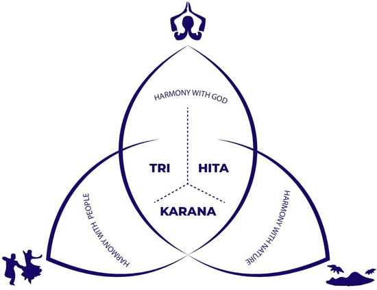 The Balinese have substantial social capital because they are supported by strong shared values, such as maintaining harmony physically and non-physically, which is contained in Tri Hita Karana (THK) or “the three causes of well-being” [4]. Social capital is one of seven components of the Community Capitals Framework (CCF), which reflects “the connections among people and organizations or the social glue to make things, positive or negative, happen” ([5], p. 21). So, in this research, the most relevant philosophy to be included that could influence destination performance was THK (Figure 1), a form of shared social capital. The THK philosophy concept was universally and globally accepted as a World Cultural Heritage in 2012, in the form of a manifestation of a cooperative social system that controls water (subak) in agriculture [6].