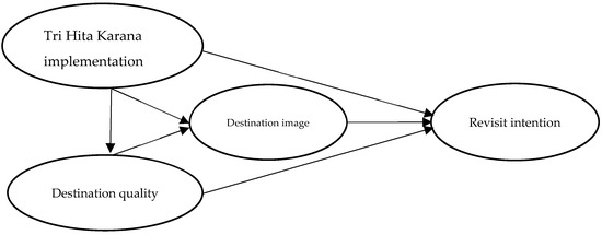 The concept of THK is a Balinese philosophy of life. THK emphasizes three human relationships in life in this world: human relationships with God (parhyangan, spiritual), relationships with fellow humans (pawongan, social), and human relationships with the natural surroundings (palemahan, natural), with each relationship being interrelated (Figure 1). THK has become the standard in implementing tourism in Bali [7]. Empirically, several studies have revealed that the quality of destinations built from local wealth influences destination image and increases intentions to visit and revisit [8,9,10,11]. The local wealth in question is usually more directed to physical or tangible assets such as accessibility [12], supporting facilities [13], and venues for tourist activities [14]. However, aspects that are intangible, such as esthetics [15] and local cultural traditions (e.g., spiritual and religious values), may be crucial in the pursuit of sustainability [11].