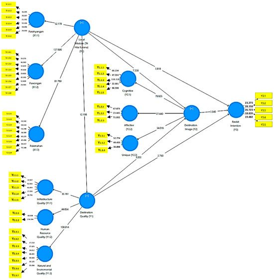 Variance inflation factors (VIFs) were used to assess the multicollinearity issue. The VIFs were from 1.150 to 1.757 (Appendix B.5), meeting the requirement of less than 3.33 [122]. Then, the proposed structural relationships were tested using the bootstrapping technique. The hypothesis testing was carried out after resampling bootstrapping. Hypothesis testing on the effect of THK implementation on destination quality, destination image, and revisit intentions was carried out by comparing the t-statistics and p-values and observing the sign of the original sample in the path coefficients table.
