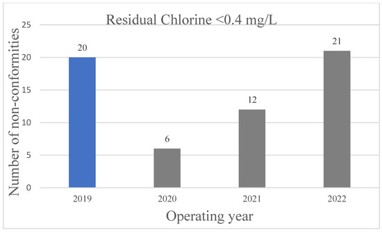 Comparison between non-conformities in the residual chlorine values < 0.4 mg/L before the COVID-19 pandemic (blue column) and for the years 2020, 2021, and 2022 (gray columns, COVID-19 era).