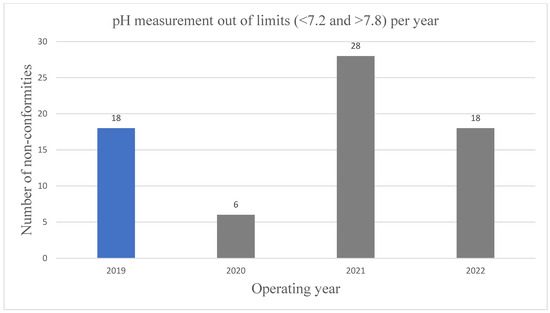 Comparison between non-conformities in the pH values (<7.2 and >7.8) before the COVID-19 pandemic (blue column) and for the years 2020, 2021, and 2022 (gray columns, COVID-19 era).