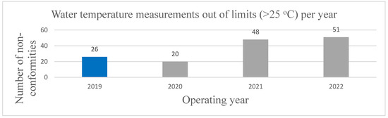 Similarly, according to the national legislation, it is imperative that the water temperature must remain below 25 °C. Maintaining the appropriate water temperature in a swimming pool is crucial for optimizing the performance, comfort, and safety of swimmers [47]. Nonetheless, in a Mediterranean country such as Greece, with elevated temperatures in the summer touristic season, this limit regulation poses a problem since most swimming pools are outdoors and exposed to sunlight and, thus, hot temperatures. The latter also affects the quantity of free chlorine, deactivating the disinfection process. Herein, a vast issue is observed for the samples measured during COVID-19 since the number of non-conformities in the water temperature values is increased from 2020 to 2022 (Figure 3) up to two times (from 26 in 2019 to 51 in 2022), which is related to the relaxation of the strict protocols over time, leading to a total degradation of the operating rules and non-regulation of the basic physicochemical parameters.
