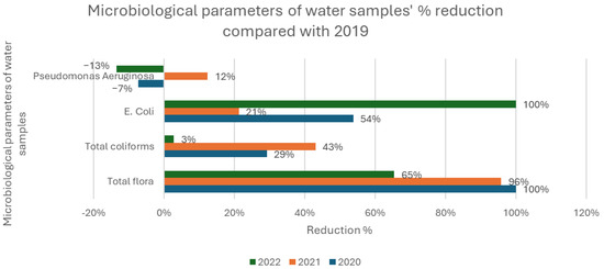 Microbiological parameters of water samples’ % reduction compared with 2019 for the years 2020 (blue column), 2021 (orange column), and 2022 (gray column).