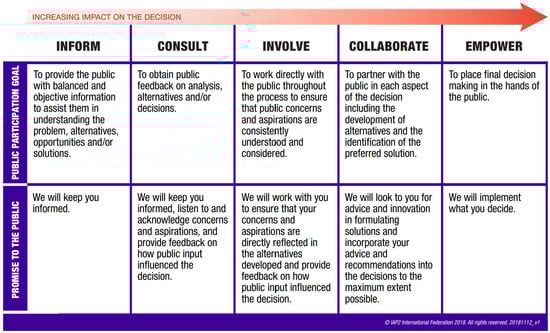 - IAP2. IAP2 Public Participation Spectrum-IAP2 Australasia. Available online: https://iap2.org.au/resources/spectrum/ (accessed on 26 September 2024).