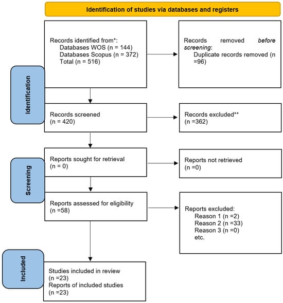 The initial search across the WOS and SCOPUS databases resulted in 516 articles. These were imported into Zotero, a reference management tool, where duplicate entries were removed, leaving 420 unique articles. After screening the abstracts, 58 articles were shortlisted for further evaluation. A detailed full-text review identified 23 articles that met the inclusion criteria (Figure 2).