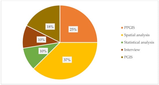 Figure 3 depicts the distribution of methodological approaches used in public participation processes, with a focus on geographical and participatory tools. Spatial analysis is the most popular approach, accounting for 37% of all methods used. PPGISs follow, accounting for 25% of the approaches. PGIS (Participatory GIS) is used in 18% of cases, with statistical analysis and interviews accounting for 10% each. This breakdown demonstrates a clear preference for spatial methodologies in public participation, with GIS-based tools being heavily used.