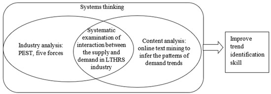 The Insight into Development Trends model (Figure 1) primarily delves into a comprehensive examination of industry trends by systematically analyzing the interplay between supply and demand within the fields of LTHRS. From the supply-side perspective, the model draws from concepts found in industry analysis, encompassing external environmental (political, environmental, social, and technical) analysis, industry dynamics, and changes in production and distribution patterns [5] as well as the application of the five forces analysis framework [6,7]. On the demand side, it places emphasis on artificial intelligence-driven online text mining to induce patterns in demand trends using secondary data sources [8].