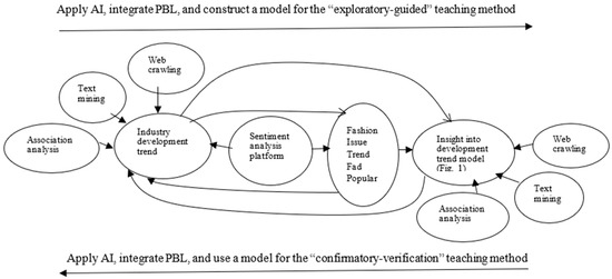 As advancements in information technologies, such as computing speed and storage capacity, continue to progress, there have been groundbreaking developments in artificial intelligence (AI) recently. The techniques for web crawling, text mining, online sentiment analysis, and association exploration analysis have become more mature. By applying AI and integrating PBL, this study proposes the “LTHRS Industry Development Trend Model” as a reference tool for “exploratory” guided teaching (see arrows in Figure 2 from left to right) and as instructional guidance for “confirmatory” teaching methods (see arrows in Figure 2 from right to left). This instructional design substantially deepens students’ positive attitudes toward AI, enhances their proficiency in AI techniques and tools, enables them to read and analyze trend reports, and cultivates insight into trends, analytical and problem-solving skills, and critical thinking abilities.