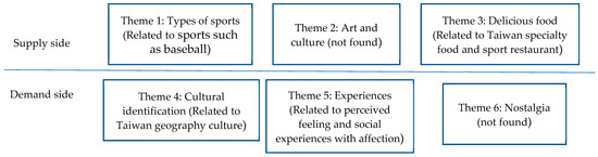 The second project examined Taiwanese elements in spectator sports. Two primary keywords, i.e., Taiwanese elements and sports (in traditional Chinese “台灣味 (tái wān wèi)” and “運動 (yùn dòng)”), were used in the Google search, and 98 articles or texts were extracted and considered relevant during this decade. The traditional content analysis found six themes, whereas AITM found four. AITM did not identify the theme of “nostalgia” due to its implicit and subtle labeling (Figure 6) [32].