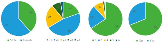A total of 49 males (38%) and 78 females (60.4%) participated in the study. In terms of age, the largest group was students aged 20 years (46.5%), while second-year students (65%) constituted the majority. Most of the participants were not raised in Athens (68.2%) (Figure 2).