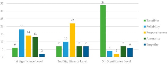 The most significant dimension was found to be “reliability” (34%), and the second most important was “responsiveness” (41.5%), while the least significant was found to be “tangibles” (64.2%) (Figure 3).
