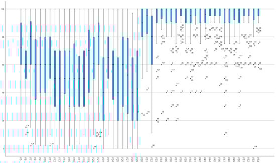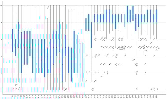 Figure 4 and Figure 5 present the boxplots of variables 5–29 (perception) and 30–54 (expectation), for underestimation and overestimation, respectively. Notably, perception demonstrated fewer outliers compared with expectation, which exhibited significantly more, in both cases.