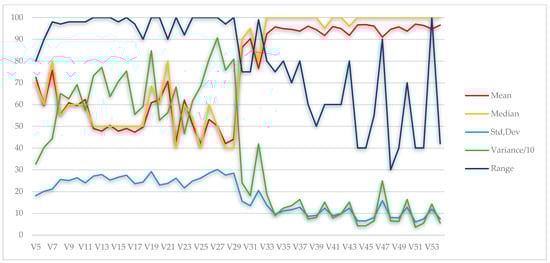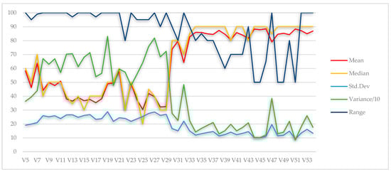 Figure 6 and Figure 7 present the basic central tendency measures for the underestimated and overestimated responses depicted in variables 5–29 (perception) and 30–54 (expectation).