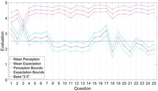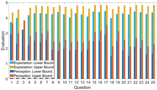 Table 2 presents the difference between the mean expectation and the mean perception for each question, scaled from 0 to 5. Table 3 presents the difference between the underestimation of expectation and overestimation of perception. For all questions—except Q3—the overestimated perception was consistently below the underestimated expectation (the minus signifies that perception was lower than expectation). These values confirmed the first case (C1) of our proposed framework, indicating that the provided services were unsatisfactory. Furthermore, the magnitude and consistency of the difference indicated that this was a well-established conclusion. Figure 8 shows the boundaries of both perception and expectation, along with mean perception and mean expectation, while Figure 9 shows them in superimposed bars, providing a visual representation of the difference between them.