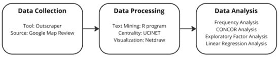 Customer satisfaction research has traditionally focused on using surveys and questionnaires as the main approaches (Brandtner et al., 2021). In this study, quantitative and qualitative methods are employed as part of a mixed-methods approach. Text mining, utilizing Outscraper and RStudio (Figure 1), was conducted in order to analyze frequently used words. Researchers have employed a range of methods for sentiment analysis, including the use of the R programming language alongside RStudio, an integrated development environment crafted specifically for statistical computing (Handani et al., 2022). These matrices underwent analysis using Freeman’s degree and eigenvector analyses to identify the most influential words within the dataset. Subsequently, UCINET was employed to assess the significance of words, and CONCOR discerned the relationship between words.