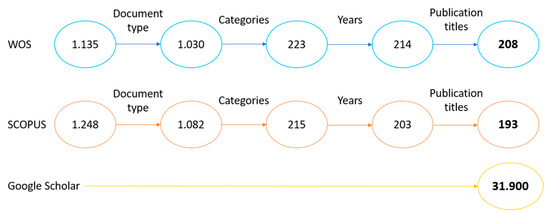 Figure 1 shows the results of the analysis process in the two databases as new search restrictions are incorporated. Ultimately, 208 articles from WoS and 193 from Scopus were selected for further analysis.