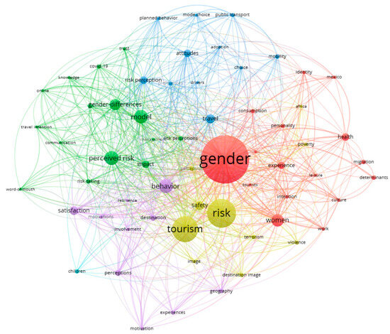 Clusters are color-coded, indicating thematic groupings. The red cluster, dominated by “gender”, connects terms such as “experience”, “women”, “health”, and “migration”. This cluster focuses on studies that explore the intersection of gender roles, personal experiences, and socio-cultural dynamics. The yellow cluster centered around “tourism” and “risk”, highlights terms such as “destination image”, “safety”, and “image”, which are indicative of the literature investigating how risk perception influences tourism decision-making and destination branding. The green cluster, including “perceived risk” and “gender differences”, addresses topics related to behavioral responses and communication strategies tied to risk perception. The blue cluster, featuring terms like “travel”, “attitudes”, and “mobility”, includes research on transportation and mode choice within the tourism context. And the purple cluster, with terms like “satisfaction”, “behavior”, and “motivations”, includes studies on tourist satisfaction.