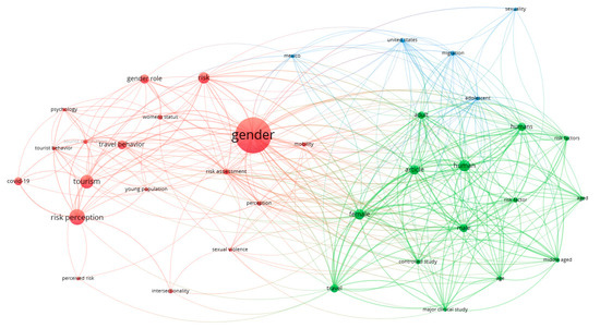 Figure 3 shows the bibliometric map generated using Scopus data that illustrates the interconnections and thematic focus within the field of gender, tourism, and risk perception. Like the Web of Science (WoS) results, the “gender” node stands out as the most prominent, indicating its central role in this body of literature. However, the Scopus results reveal some notable differences that provide additional insights into the structure of this field of research.