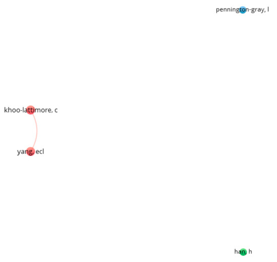 The bibliometric analysis from Web of Science, shown in Figure 4, reveals a clear concentration of authors who are highly relevant in the domain of tourism, risk perception, and gender. Four authors emerge as the most frequently cited and connected. Among these, two authors stand out for their collaborative work: Khoo-Lattimore, C. and Yang, E.C.L. Notably, they have co-authored several articles, which is evident in the strong connection between their nodes in the map. Additionally, Pennington-Gray, L. and Han, H. are also prominent figures in this research area, although they are primarily represented individually on the map, with no significant co-authorship links within the scope of this study. Notably, Berdychevsky, L. does not appear in this specific map, as her publications on the topic are not present in the Web of Science database, which highlights the limitations of the database and the potential for further exploration in other repositories.