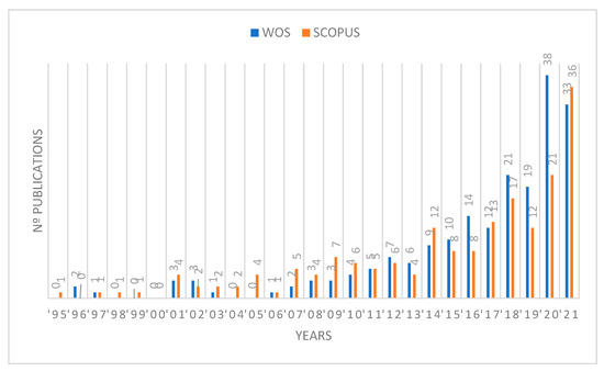Evolution of the annual number of articles in the “gender, risk, and destination” field based on WoS and Scopus. Source: own elaboration based on information extracted from WoS and Scopus.