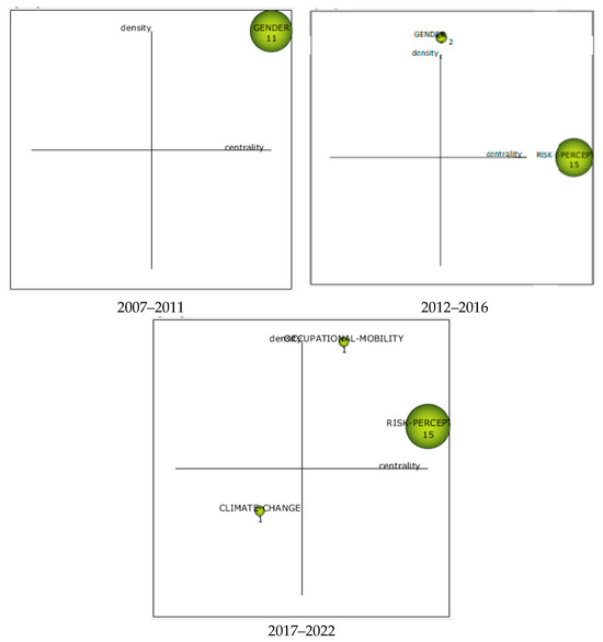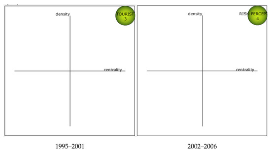 To conclude the analysis using traditional metrics, Figure 7 shows the strategic diagrams created using the SciMAT tool based on the results obtained from the WoS search (Cobo et al., 2012). These diagrams provide an overview of the evolution of the topics (Cobo et al., 2011, 2014) addressed within the topic of research on “gender, risk, and tourist destinations”. When creating the diagrams, the data were refined beforehand (Cobo et al., 2012), and authorships were unified in cases where authors were identified differently; for example, Elaine Chiao Ling Yang, identified as both “Yang, E.C.L.” and “Yang, ECL”. In this case, we opted for “Yang, E.C.L.” as a means of identification. Keywords unifying plural forms, such as “risk” and “risks”, and other purifications, such as unifying “perceived risk” and “risk perception”, were dealt with likewise.