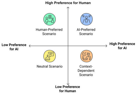 Table 2 presents the frequencies and percentages of preferred service types by scenario. Further ANOVA results indicated a significant difference in mean Likert preference scores across these scenarios . Additionally, a Kruskal–Wallis test confirmed that service-type preference varies substantially with scenario complexity.