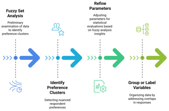 The iterative approach depicted in Figure 2 begins with Stage 1: Fuzzy Set Analysis, where Likert-scale data is preliminarily examined to identify nuanced preference clusters (e.g., those leaning “somewhat satisfied” rather than exclusively “satisfied” or “neutral”) (Dosek, 2021; Dragan & Isaic-Maniu, 2022). Stage 2 uses these insights to refine the parameters employed in subsequent statistical evaluations. For instance, if fuzzy set analysis reveals a significant overlap between “neutral” and “somewhat satisfied” respondents, researchers may group or label variables accordingly. Stage 3 focuses on applying quantitative methods, including Chi-Square tests, ANOVA, and Regression, to test the relationships among key predictors (e.g., passenger age, AI familiarity) and outcomes (e.g., trust, satisfaction) (He et al., 2021; Wu et al., 2022). Finally, Stage 4 integrates both fuzzy set insights and conventional statistical findings to form a holistic interpretation.