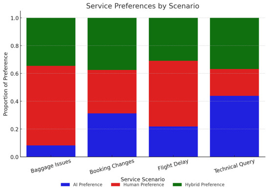 A Chi-square test was conducted to evaluate the association between service scenarios and preferred interaction types, revealing a statistically significant relationship This finding suggests that passenger preferences vary according to the nature of the service scenario. Specifically, there is a marked preference for AI interactions in technical queries (routine, transactional scenarios), supporting Hypothesis 1, whereas baggage issues and flight delays (complex, emotionally charged scenarios) demonstrate a preference for human interaction, corroborating Hypothesis 2. Further, both ANOVA and Kruskal–Wallis tests confirm the significant variance in service type preferences across different complexity levels Figure 5 illustrates the proportion of AI, human, and hybrid preferences across service types.