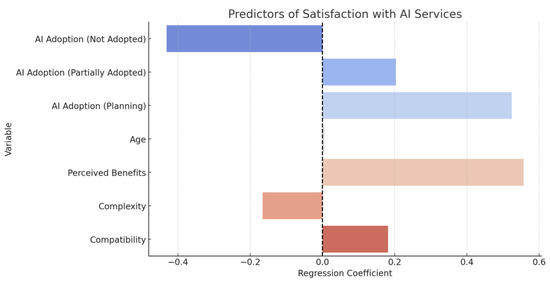 AI adoption status and age were not significant. The positive influence of perceived benefits aligns with Hypothesis 4, while the negative coefficient on complexity confirms the preference for human-led service in more challenging contexts. Figure 6 represents the regression coefficients for satisfaction determinants (see Figure 6).