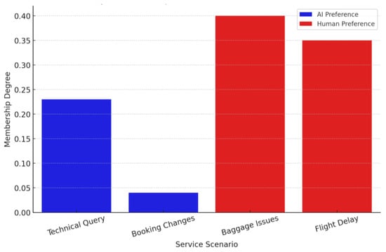 This section delineates the outcomes of a mixed-methods analysis, merging statistical methodologies with fuzzy set theory to investigate passenger preferences for AI-driven, human-led, and hybrid customer service in the airline industry. The sample, as referenced in Table 1 of Section 3.2, exhibits diversity in age and AI experience, offering a comprehensive view of service interaction preferences.