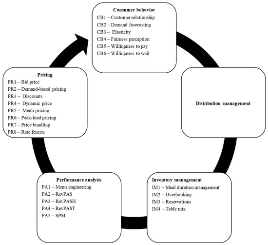 According to the review, the RM areas could be classified into five major groups, which are the following: pricing, inventory management, distribution management, performance analysis, and consumer behavior. Within pricing, other subareas were highlighted in the scientific articles under study, such as price bundling, dynamic price, bid price, peak-load pricing, demand-based pricing, discounts, rate fences, and menu pricing. Inventory management is subdivided into four subareas, namely reservations, meal duration management, table mix, and overbooking. As far as the distribution management domain is concerned, there is still just one subdomain: online delivery. The performance analysis identified the menu engineering and the indicators. Finally, consumer behavior was divided into seven subareas, which are: customer satisfaction, customer relationship, fairness perception, willingness to pay, willingness to wait, forecast, and elasticity, as shown in Figure 1.