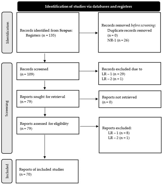 The publishing dates of the documents considered spanned from the beginning of journal publication until 17 January 2023 (inclusion criteria TR–1). All the articles found were in English. In the initial sample, there were 135 documents from the Scopus database without duplicates.