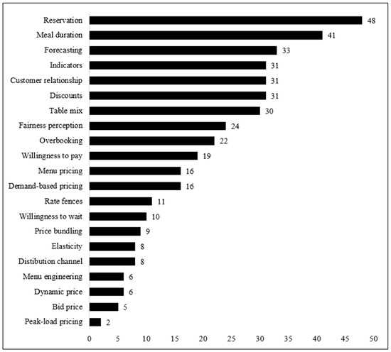 As can be seen in Figure 3, several RM practices are used exclusively in the restaurant industry, such as meal duration management, table mix, willingness to wait, menu pricing, menu engineering, and various performance indicators (RevPAS, RevPASH, RevPAST, and SPM). More information on these RM practices is presented below in the discussion of the results. It is important to note that, although it is not an RM practice, customer satisfaction is a common goal shared by most practices, being present in 50% of the studies analyzed.