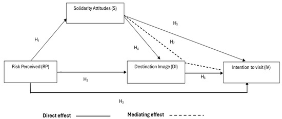 Based on the previous literature review, the following theoretical model was developed to examine the influence of risk perception on solidarity attitudes, destination image and visit intentions, and the effect of solidarity attitudes on destination image and intention to visit. The model establishes seven hypotheses, six of which have a direct effect on the previously described constructs and a mediating effect between solidarity attitudes and visit intentions through destination image (Figure 1).
