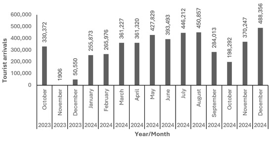 Figure 2 shows the evolution of tourist arrivals in Acapulco from October 2023 (the period in which Hurricane Otis had its greatest impact) to December 2024 (Datatur, 2025). It can be observed that the arrival of domestic tourists after October 2023 had a significant impact, reducing the number of tourist arrivals from 330,372 to 1906 tourists. However, a recovery in tourist arrivals was observed in December 2023, which continued to grow steadily in 2024. The contribution of domestic tourism to the destination should be highlighted, since it represents 90% of tourist arrivals to Acapulco, which is why a recovery in the number of arrivals to the destination is observed in the months of November and December 2024.