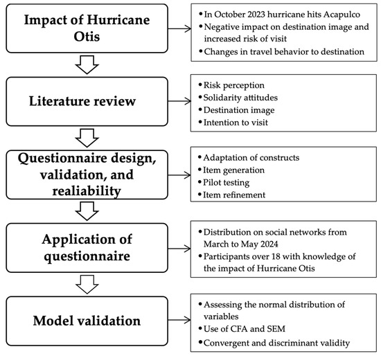 The research approach of this study is briefly described in Figure 3. A questionnaire was designed and distributed through the Google Forms® platform, which was shared on different social networks such as Facebook and WhatsApp, especially among people from central Mexico, due to its proximity to the destination and being one of the main markets of Acapulco. A pilot questionnaire was used with 30 participants to refine the items and improve the instrument (Rojas-Rivas et al., 2020). After revision and correction, convenience sampling was applied, which allows a quick approach to the object of study with reliable results (Guerrero et al., 2010). However, generalization of results is a limitation of this type of sampling. This research does not seek to generalize our findings about natural disasters, but rather to understand how risk perceptions and solidarity attitudes influence the image and intention to visit destinations after a disaster, taking as a case study the emblematic destination of Acapulco in Mexico.