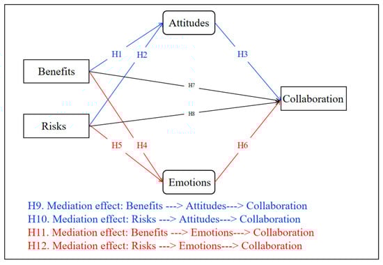 This study integrates CAT, AET, TAM, and SOR theories to construct a comprehensive framework for understanding how perceived benefits and perceived risks influence employees’ willingness to collaborate through attitudes and emotions. The conceptual model is summarized in Figure 1.