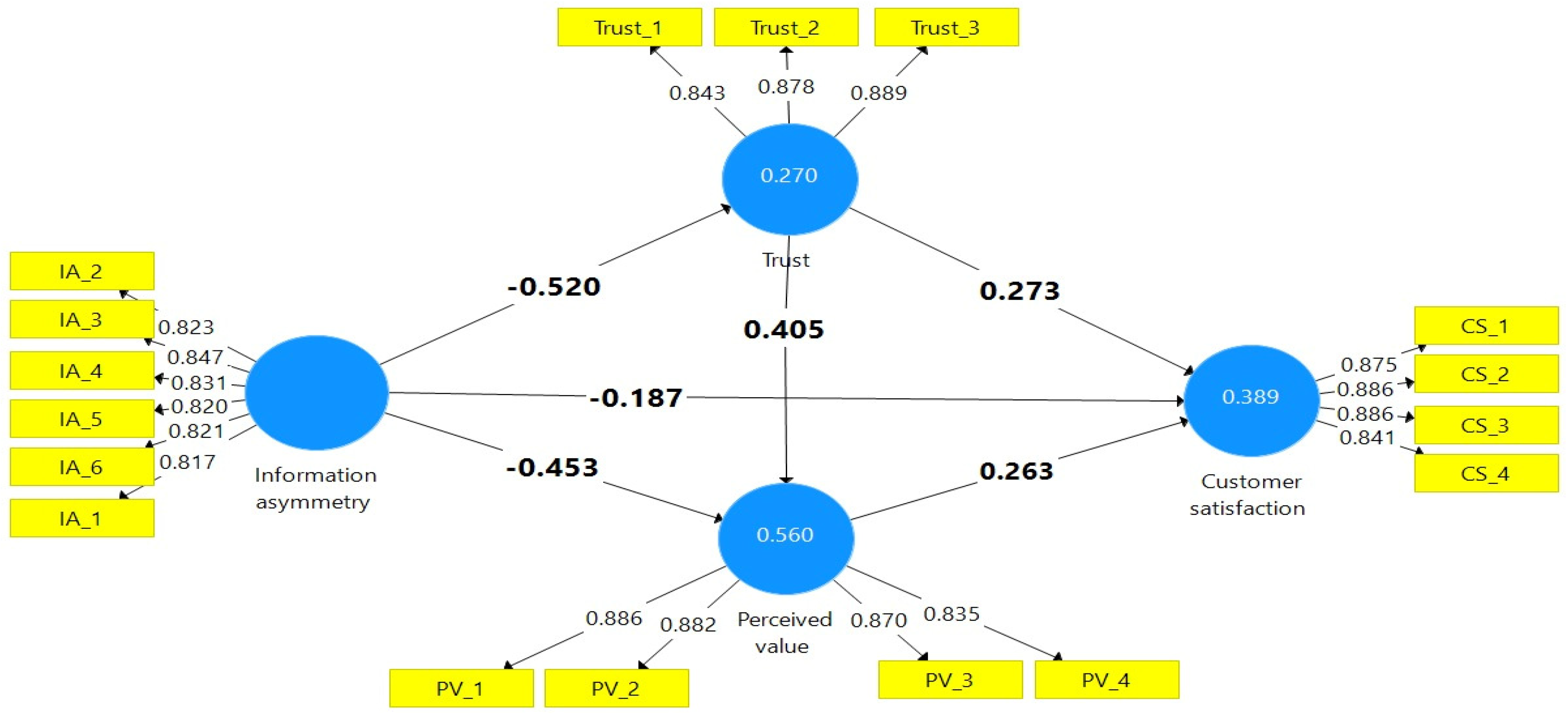 The study investigates how information asymmetry affects customer satisfaction in the tourism industry by examining trust and perceived value as mediating factors. The research implements an integrated model to test and prove information asymmetry’s direct and mediating effects on customer satisfaction by examining the literature gap. The research used a quantitative approach based on opinion polls distributed to 408 customers of hotels, tourism companies, and travel agencies who were in Egypt. SmartPLS 3 software implemented the data analysis process using partial least squares structural equation modeling (PLS-SEM). Previous studies have developed scales to measure information asymmetry and its related constructs, including customer trust, perceived value, and customer satisfaction. Multiple tests showed that the measurement tools possess both reliability and validity. Results strongly support all hypotheses: information asymmetry demonstrated significant direct negative effects on customer satisfaction (β = −0.187), trust (β = −0.520), and perceived value (β = −0.453). Conversely, customer satisfaction received significant positive direct effects from both trust (β = 0.273) and perceived value (β = 0.263). Importantly, trust (indirect effect β = −0.142) and perceived value (indirect effect β = −0.119) acted as powerful mediators, confirming that information asymmetry diminishes satisfaction largely by eroding these crucial factors. Crucially, the results demonstrate that the negative impact of information asymmetry on customer satisfaction is significantly mediated jointly through two parallel pathways: the erosion of customer trust and the impairment of perceived value. The research adds theoretical support to information asymmetry theory with its findings while also extending trust theory, perceived value theory, and expectancy disconfirmation theory in the field of e-commerce. E-commerce entities must establish clear communication to gain customer trust and create perceived value that helps compensate for information asymmetry to create enhanced customer loyalty and superior market position.
