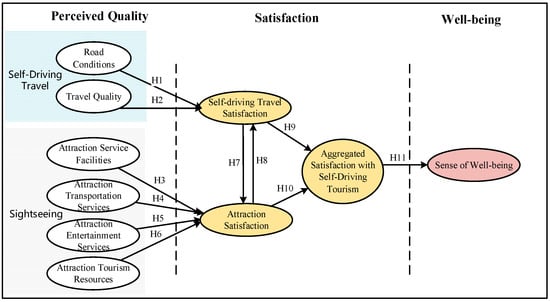 High perceived quality fosters positive travel experiences, which is a critical factor influencing satisfaction, while increased satisfaction enhances tourists’ happiness. To explore the mechanism by which self-driving tourism contributes to happiness, this paper employs a framework of “perceived quality—satisfaction—happiness” and proposes the following eleven hypotheses (H1–H11), as illustrated in Figure 1.
