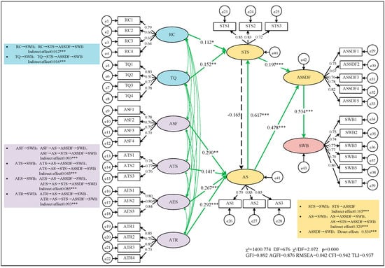 Based on the theoretical model constructed (Figure 1), a model fit analysis was conducted using Amos 23 software. The modified model obtained optimal fit results, with all indicators meeting standard value requirements except for the Goodness of Fit Index (GFI), which was 0.892, and the Adjusted Goodness of Fit Index (AGFI), which was 0.876, both of which are within acceptable ranges. Overall, the model demonstrated good fit (Table 6).