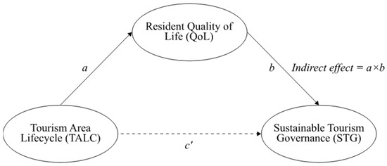 Addressing these gaps, the present study develops and tests an integrated structural equation modeling (SEM) framework that (1) quantifies the direct effect of TALC dimensions on residents’ QoL (e.g., safety, healthcare, cultural integrity); (2) assesses the direct effect of residents’ QoL on Sustainable Tourism Governance (STG); (3) examines the direct effect of TALC on STG, independent of QoL; and (4) evaluates the mediating role of residents’ QoL in the relationship between TALC dimensions and STG, specifically testing for partial mediation.
