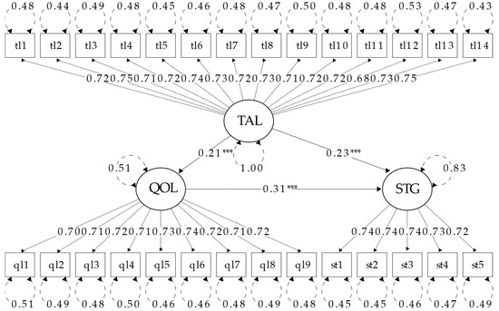 Structural model diagram with standardized path coefficients. All paths are significant at p < 0.001 and QoL mediates the TALC–STG relationship. Note: *** p < 0.001. Covariates omitted for clarity.