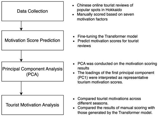 This study adopts a hybrid methodology that integrates advanced natural language processing (NLP) techniques with statistical modeling to identify and interpret the underlying motivations of Chinese tourists visiting Hokkaido. The approach builds on prior work in computational tourism research and aims to overcome the limitations of traditional survey-based methods by leveraging large-scale user-generated content (UGC). The overall workflow is depicted in Figure 1 and comprises four major phases: (1) data collection, (2) motivation score prediction using a fine-tuned Transformer model, (3) dimensionality reduction through principal component analysis (PCA), and (4) validation and analysis of motivational patterns. Each step is described in detail in Section 3.1, Section 3.2, Section 3.3 and Section 3.4.