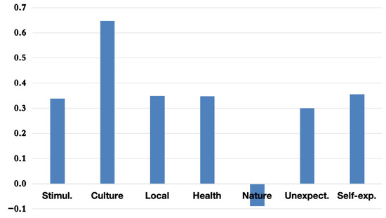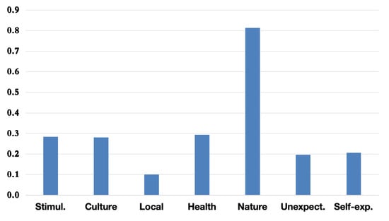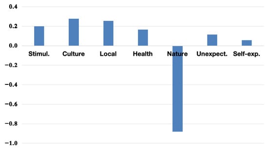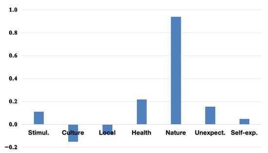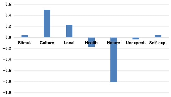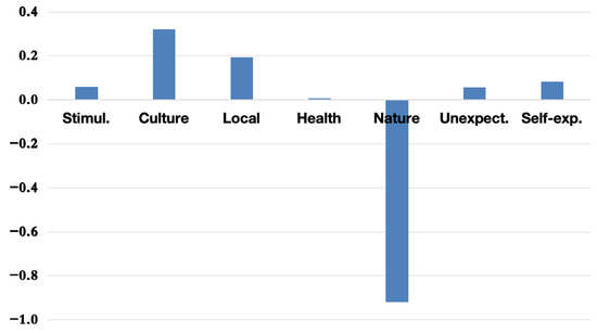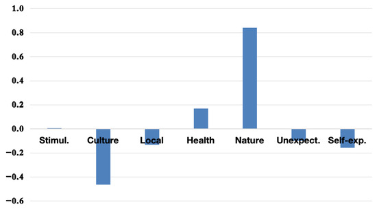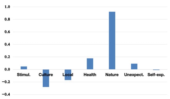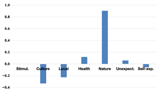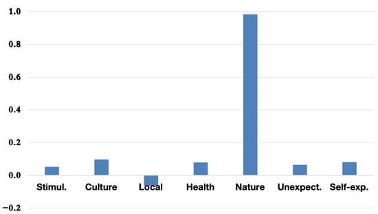 The PCA results indicate that the first principal component (PC1) consistently captures the Nature dimension as the most influential motivational factor for overall tourism in Hokkaido. This trend is illustrated in Figure 2, where Nature displays the highest loading on PC1.