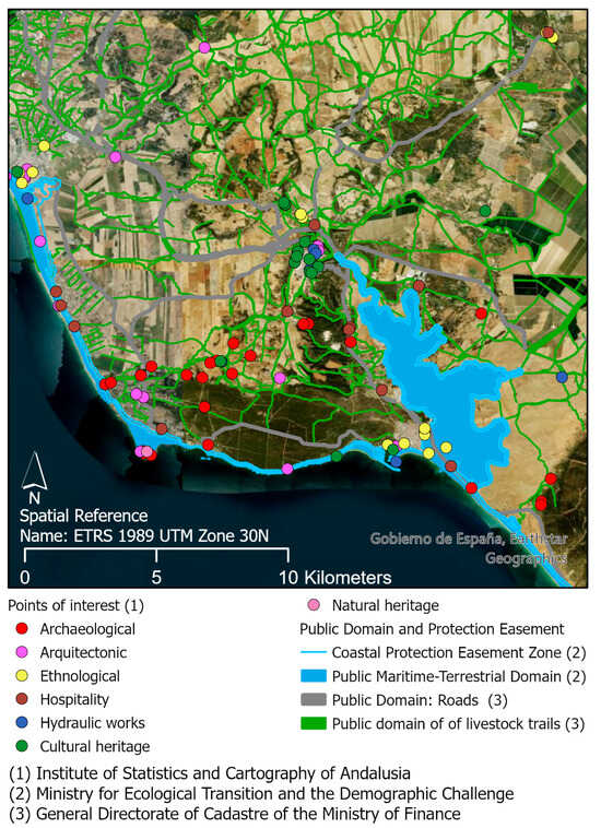 - Geographic Information Systems (GIS): A cartographic database was developed to integrate land use, protected areas, accessibility networks, and coastal morphological features. Additionally, a georeferenced inventory of cultural and natural heritage assets was compiled to identify areas of symbolic, historical, and tourism relevance. This inventory includes archaeological sites, architectural landmarks, ethnological features, hydraulic works, hospitality-related heritage, and elements of cultural landscape—such as traditional roads or livestock trails—mapped using official spatial data from regional and national institutions. Layers corresponding to public domain zones (e.g., roads, coastlines, easements) were also integrated to assess legal and planning constraints. Together, these spatial layers enabled the detection of priority areas for intervention, misalignments between resources and planning tools, and opportunities for the development of low-impact, identity-based tourism strategies.Spatial data were cross-validated through cartographic triangulation and comparison with secondary sources to ensure analytical reliability. The validation criteria included (i) temporal coherence—only data from the last 5–10 years were used; (ii) adequate spatial resolution (minimum 1:25,000); and (iii) thematic relevance to tourism–environment interactions in coastal zones. These parameters ensured that the spatial analysis reflected current territorial dynamics and supported accurate diagnosis.