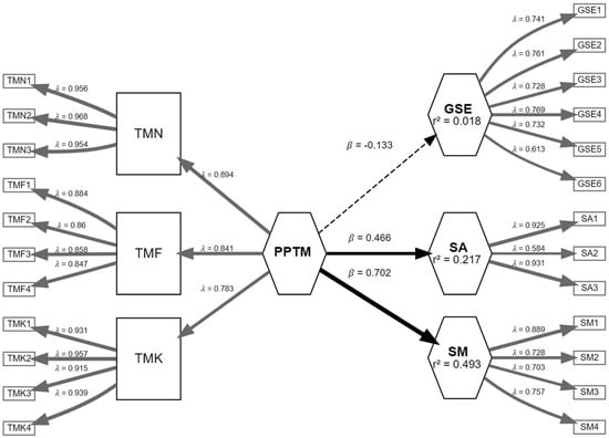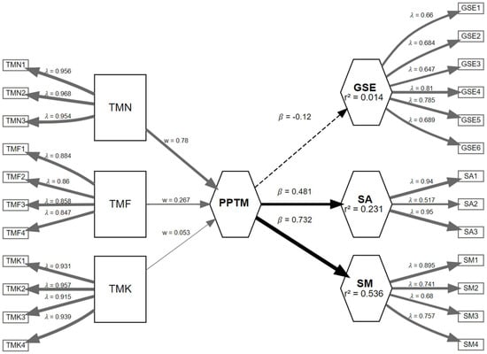 Reflective–formative model of PPTM predicting GSE, SA, and SM.