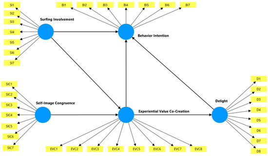 In the digital tourism environment, surfing involvement reflects the degree of attention, interest, and emotional engagement that consumers invest when browsing online information related to destinations or travel experiences. According to (), individuals with high involvement process information more deeply, which increases their cognitive and emotional connection to the content. This heightened engagement enhances the opportunity for experiential value co-creation, as tourists actively construct personal meaning and preferences during their online interactions (). The service-dominant logic framework posits that value is co-created through collaborative interactions between consumers and service providers, especially when users contribute knowledge, feedback, or personalized engagement during their digital experience (). Empirical studies also support that deeper online involvement, such as interacting with virtual reality content or destination storytelling, can foster anticipatory emotions, immersion, and co-created value in tourism (; ; ). Therefore, our first proposed hypothesis is as follows: