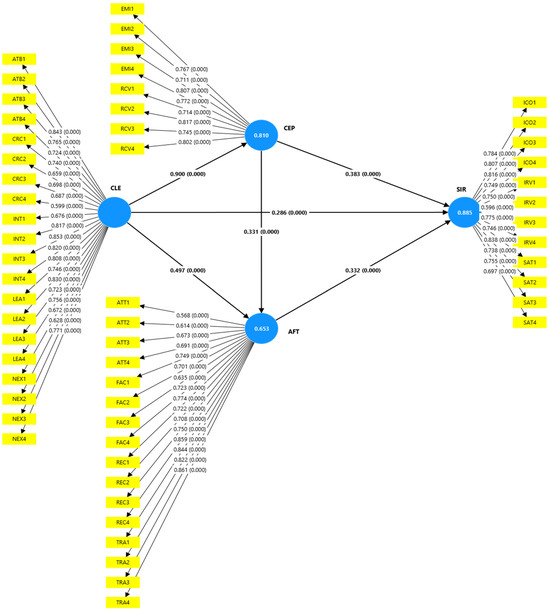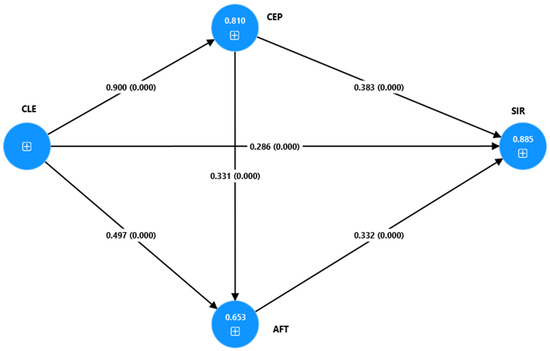 The results of the direct effects are shown in Table 9, indicating that CLE has the strongest direct influence on CEP (β = 0.900, p < 0.001). As presented in Table 9, both AFT and CEP significantly predict SIR with positive path coefficients.