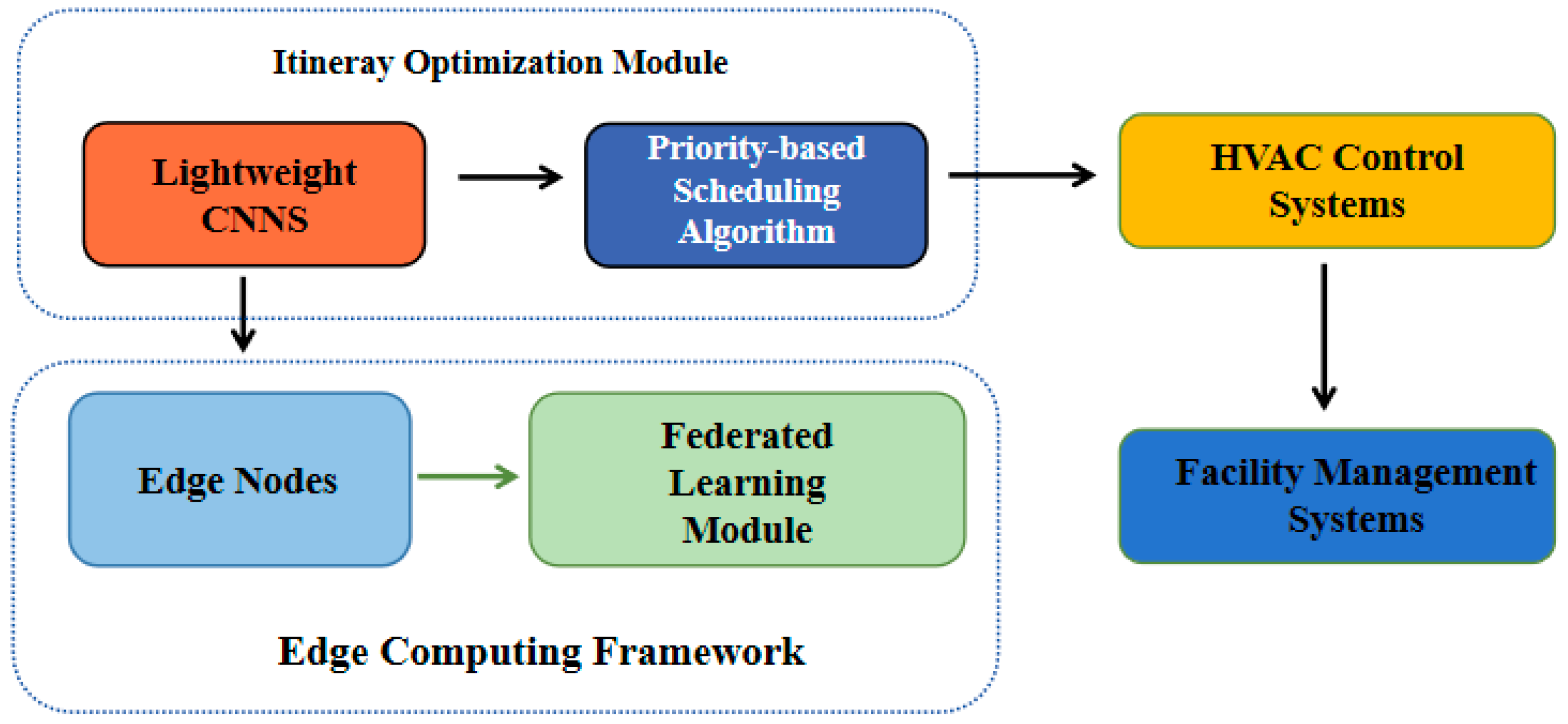 Figure 1 integrates multiple core components working in concert. Lightweight convolutional neural networks process participant profiles and real-time health data, while a priority-based scheduling algorithm enables dynamic itinerary adjustments based on changing conditions. An edge computing framework efficiently distributes computational tasks across personal devices and infrastructure nodes, optimizing resource utilization. Complementing this, a federated learning module facilitates privacy-preserving model aggregation across the system without compromising individual data security.