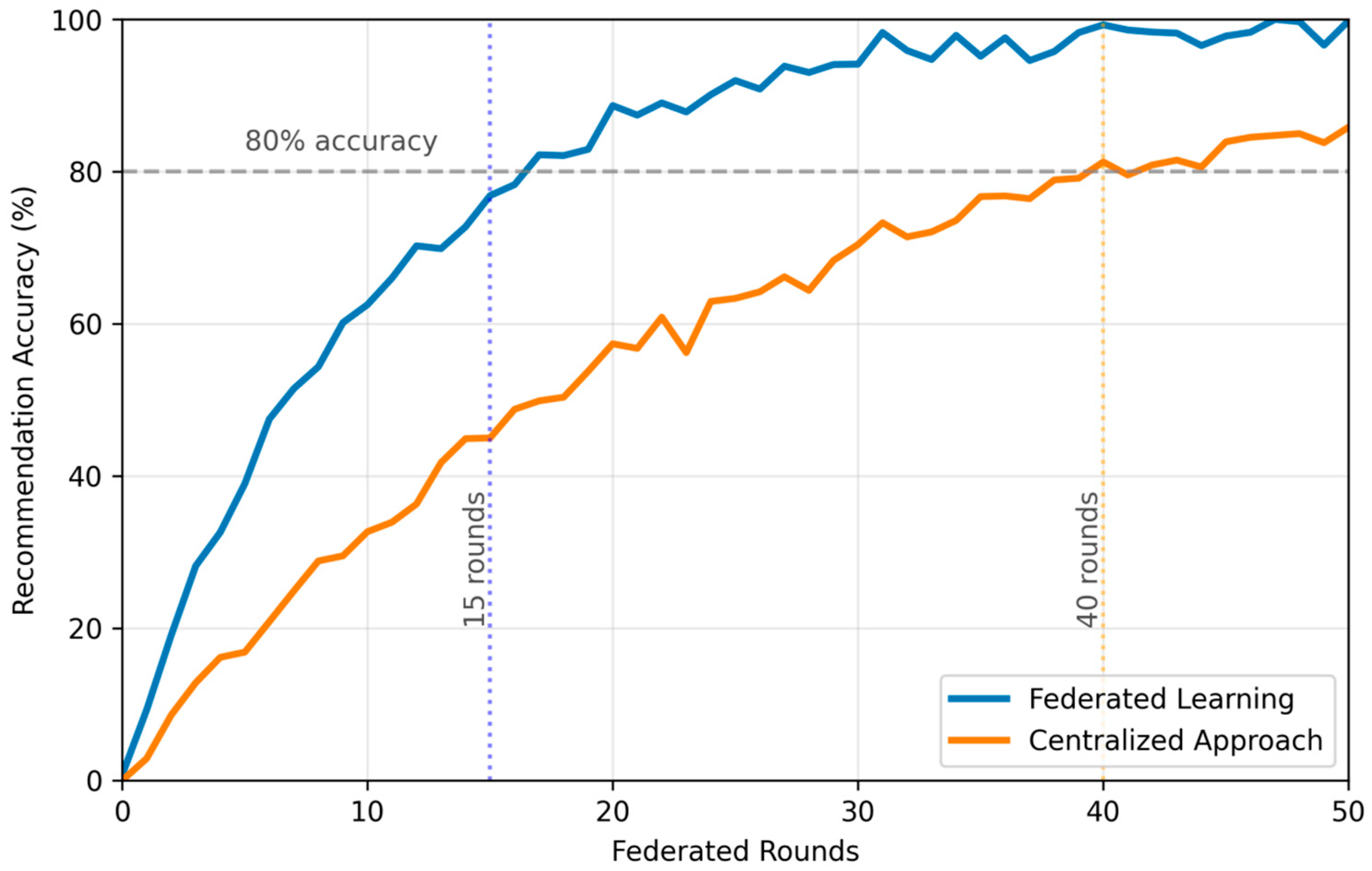 Figure 2, our framework reaches 80% of maximum accuracy within 15 federated rounds, compared to 40 rounds required by centralized approaches. This accelerated convergence results from the diversity of local datasets across tourism operators, which collectively cover broader activity patterns.